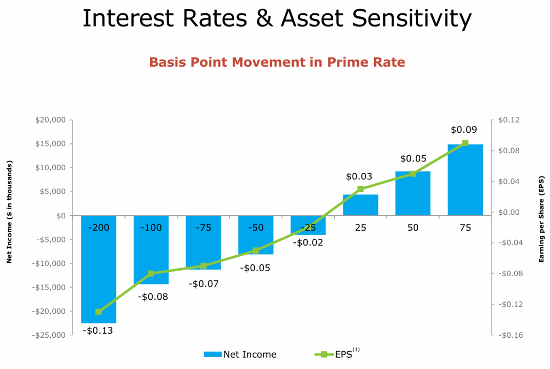 Interest Rate Risk is another exposure investors need to consider. As you can see in the following chart, Hercules’ net income and earnings per share will decline sharply if rates are cut (remember, nearly 100% of the loans Hercules makes are floating rate, not fixed).