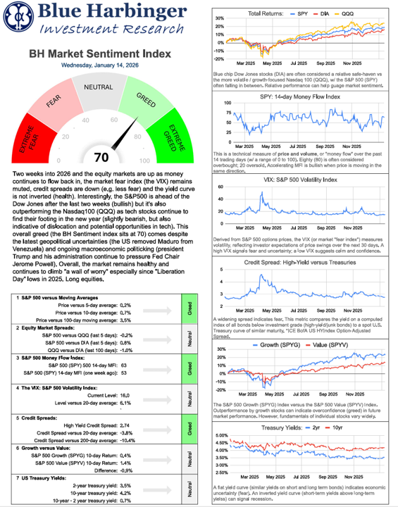 After 3 consecutive strongly-positive years for US stocks (see graph), 2026 is off to a healthy start, despite geopolitical risks (Maduro removed from Venezuela) macroeconomic political risks (the Trump administration continues to pressure Fed Chair Jerome Powell), as the BH Market Sentiment Index sits at 70 (Greed).