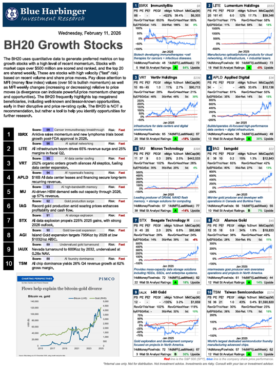 The BH20 uses quantitative data to generate preferred metrics on top growth stocks with a high level of recent momentum. Stocks with market caps over $500 million are scored and ranked, and the top 20 are shared weekly. These are stocks with high velocity ("fast" risk) based on recent volume and share price moves. Pay close attention to MFI (money flow index) values (over 50 is bullish momentum) as well as MFI weekly changes (increasing or decreasing) relative to price moves (a divergence can indicate powerful price momentum changes and opportunities). The BH20 frequently highlights top megatrend beneficiaries, including well-known and lessor-known opportunities, early in their disruptive and price re-rating cycle. The BH20 is NOT a recommendation, but rather a tool to help you identify opportunities for further research.
