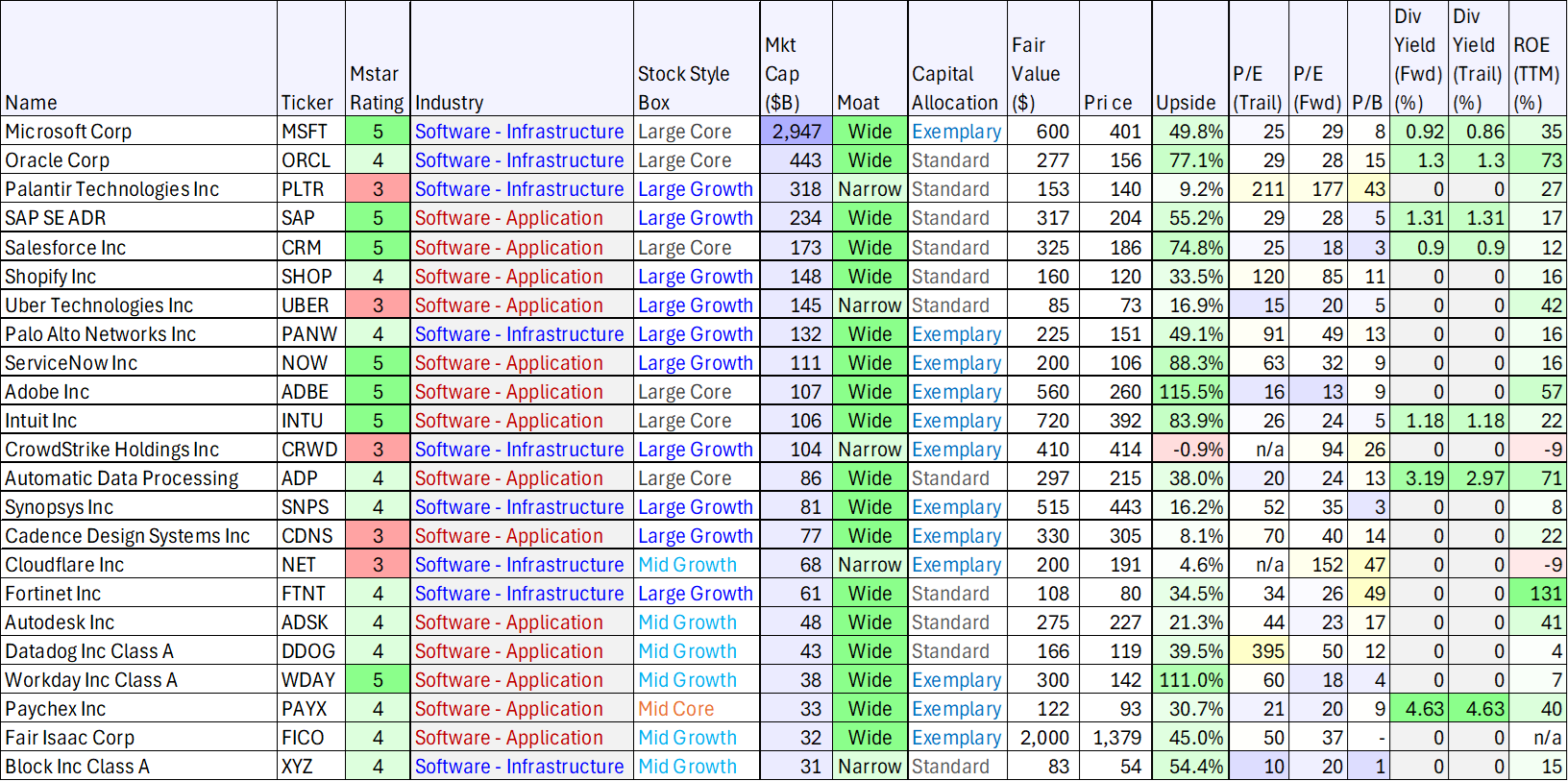Briefly sharing some updated data on the absolute blood bath in software stocks as the market believes AI (such as Anthropic’s release of the legal plugin for its large language model Claude) will devour traditional software. Names like Microsoft (MSFT), ServiceNow (NOW) and Adobe (ADBE) are down big—yet still very profitable and growing. Will have more to say soon about specific names, but here is a look at 40+ top software stock ratings from Morningstar (moat ratings, BIG price upside potential and more). In a few years, you may look back and wish you bought more. Enjoy the data!