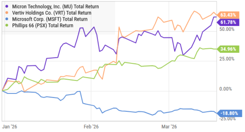 Importantly, the structural story around artificial intelligence (see chart above) continues to strengthen. Demand for compute, data infrastructure, and advanced semiconductors remains robust. Blue Harbinger holdings like Vertiv (VRT) and Micron Technology (MU) have surged on this theme, reflecting real capacity constraints and accelerating capital investment cycles.