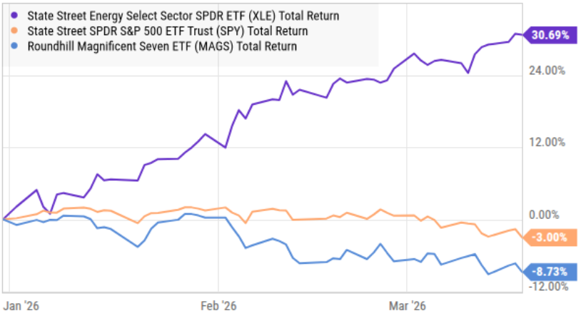 At the same time (as you can also see in the chart above) The Magnificent 7 mega-cap stocks (MAGS) have pulled back meaningfully, as higher input costs (i.e. energy) and macro uncertainty weigh on sentiment. However, this is not a collapse in fundamentals—but a repricing after an extended period of dominance.